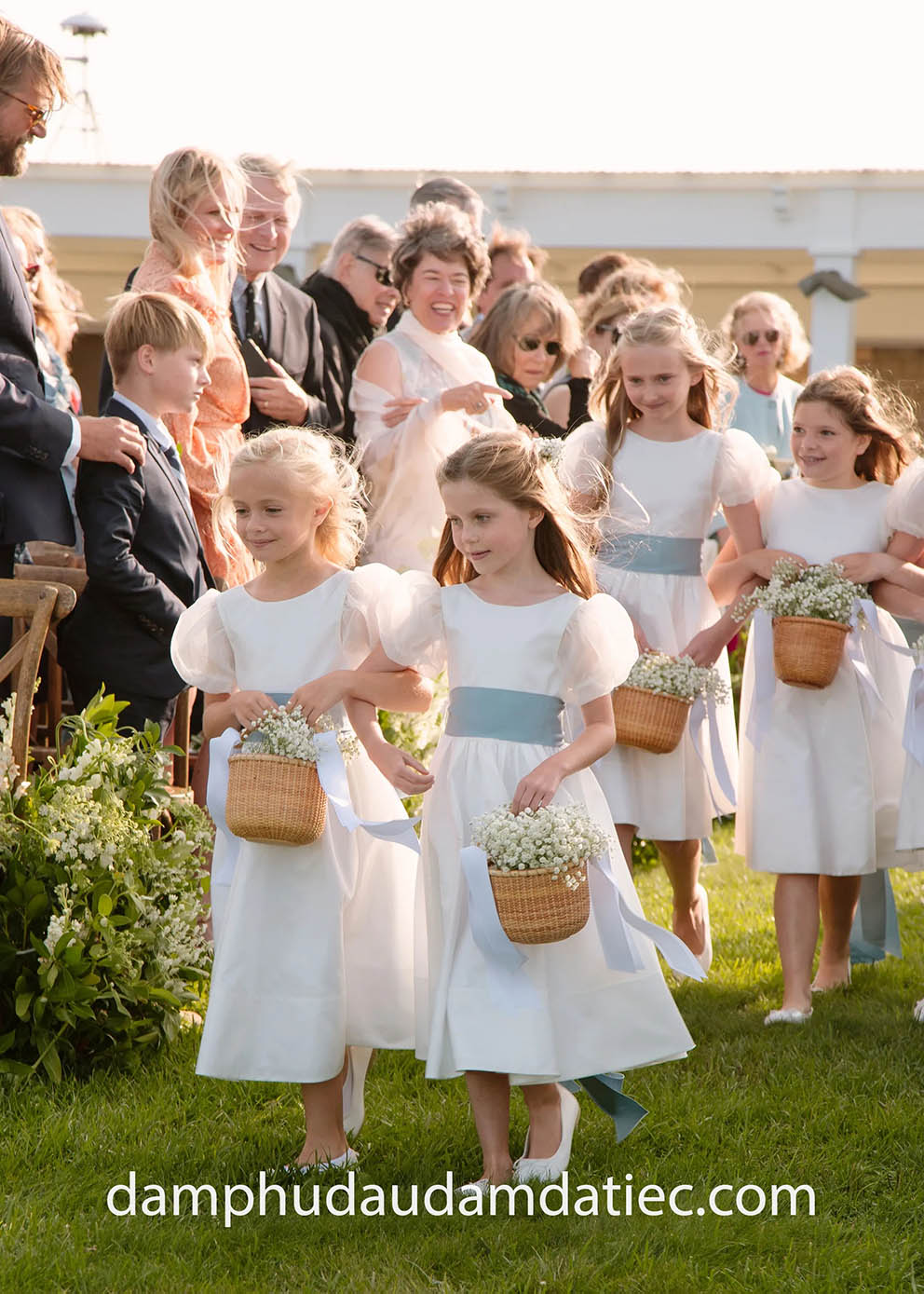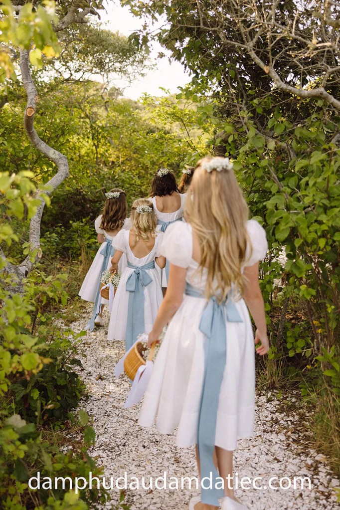 Ngày cưới của bạn sẽ càng thêm đáng yêu khi có sự xuất hiện của dàn phù dâu nhí xinh như thiên thần. Những mẫu váy phù dâu cho bé gái đẹp nhất trong form váy midi dress tùng xoè, thực hiện trên chất vải satin sang trọng có cổ thuyền lịch sự cùng tay áo phồng trendy. Nổi bật nhất là những dải nơ màu xanh “something blue” sẽ giúp bộ váy thêm phần xinh xắn và mang ý nghĩa may mắn đến đám cưới của bạn.
