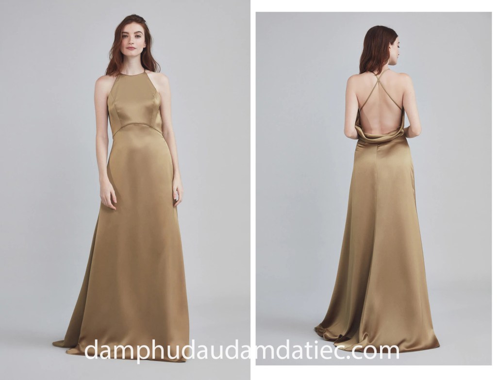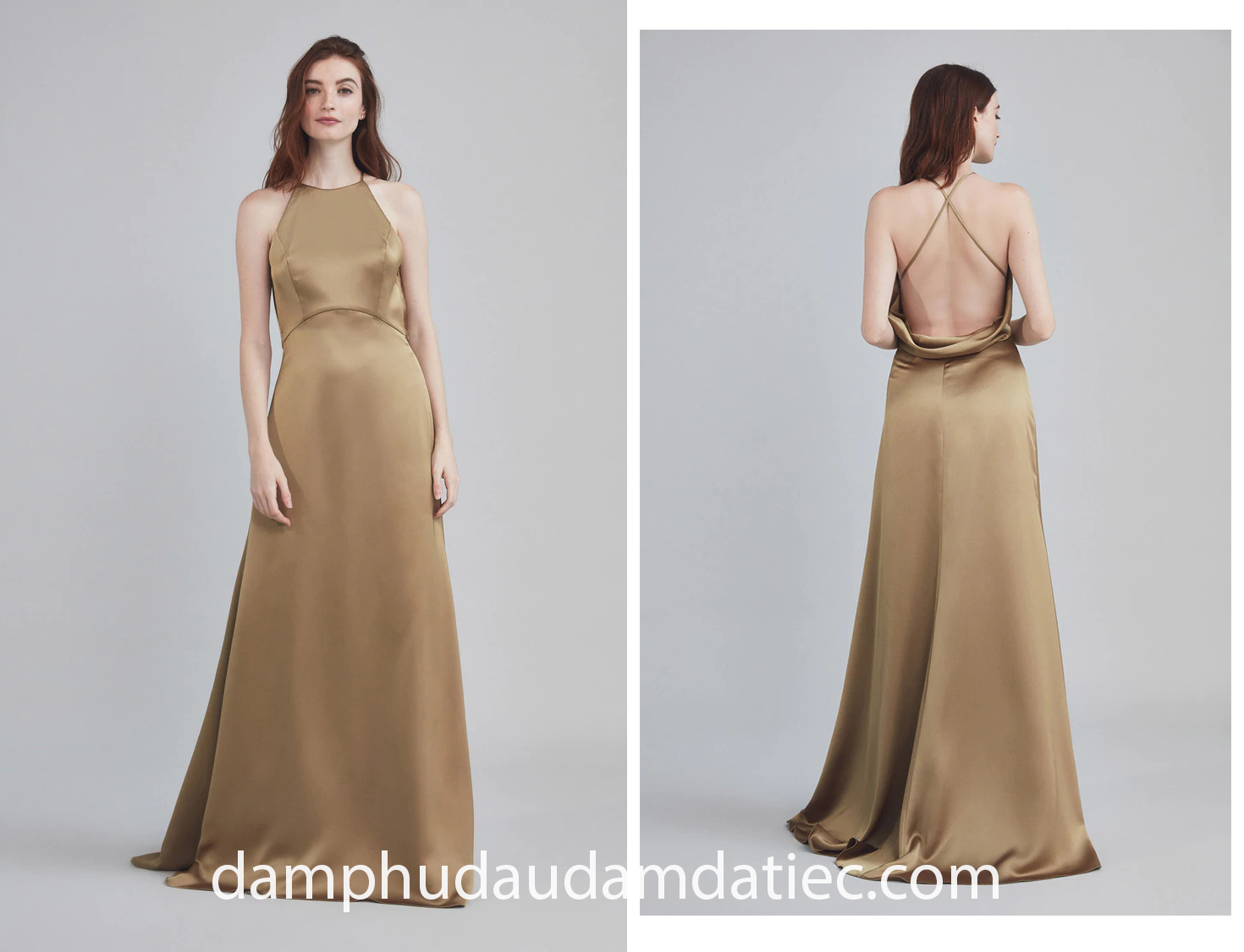 Đầm phù dâu cổ yếm với gam màu cát có lưng xẻ sâu cổ đổ sexy, rất thích hợp cho những đám cưới tổ chức trên bãi biển với nắng vàng, cát trắng và biển xanh gọi mời.