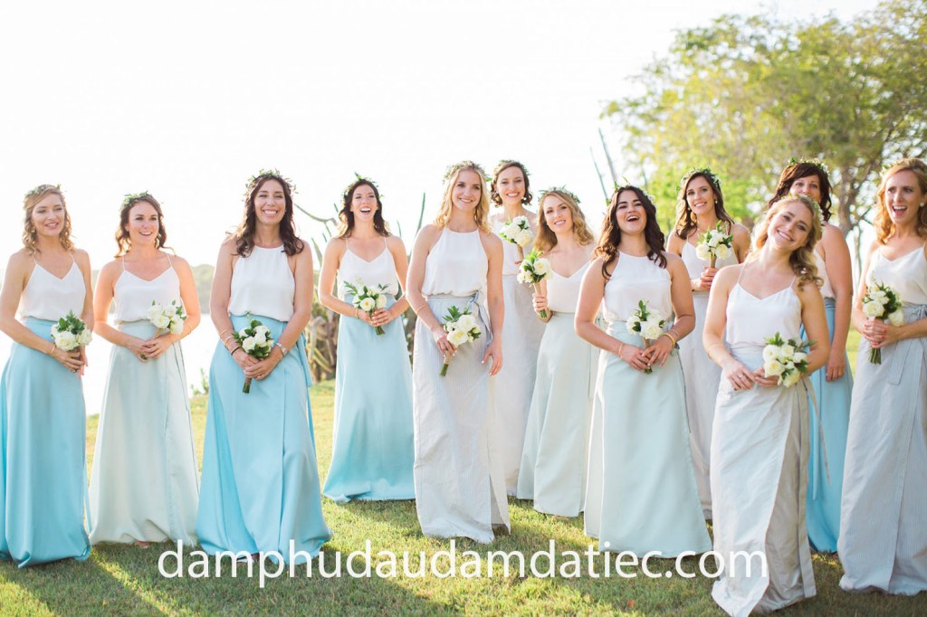 Bạn cũng có thể phối hợp nhiều gam màu xanh tươi mát trên cùng một tone màu xanh biển để mang đến sự đa dạng, mới mẻ cho những mẫu đầm phù dâu dự đám cưới bãi biển.