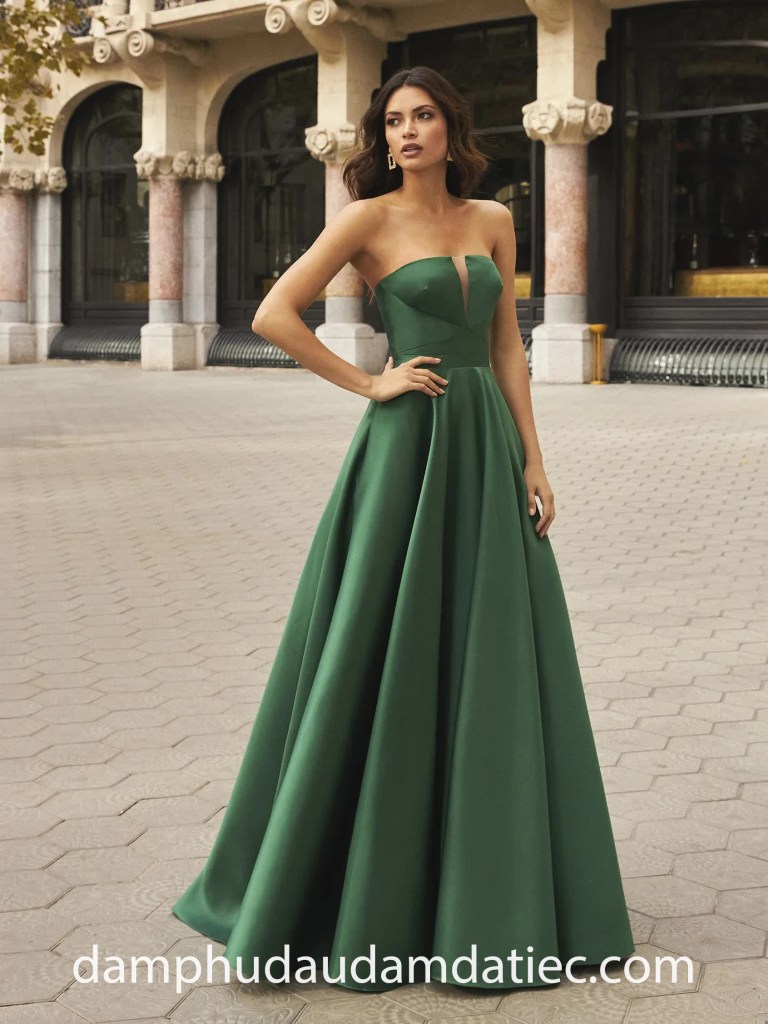 Đầm phù dâu màu xanh rêu từ thương hiệu Pronovias cũng sẽ là một lựa chọn mới lạ giúp đám cưới trên biển của bạn thêm phần đặc sắc. Kiểu váy chữ A tùng xoè thực hiện trên chất vải satin, cúp ngực cong xẻ V sâu gợi cảm thích hợp cho hầu hết tất cả các dáng người.