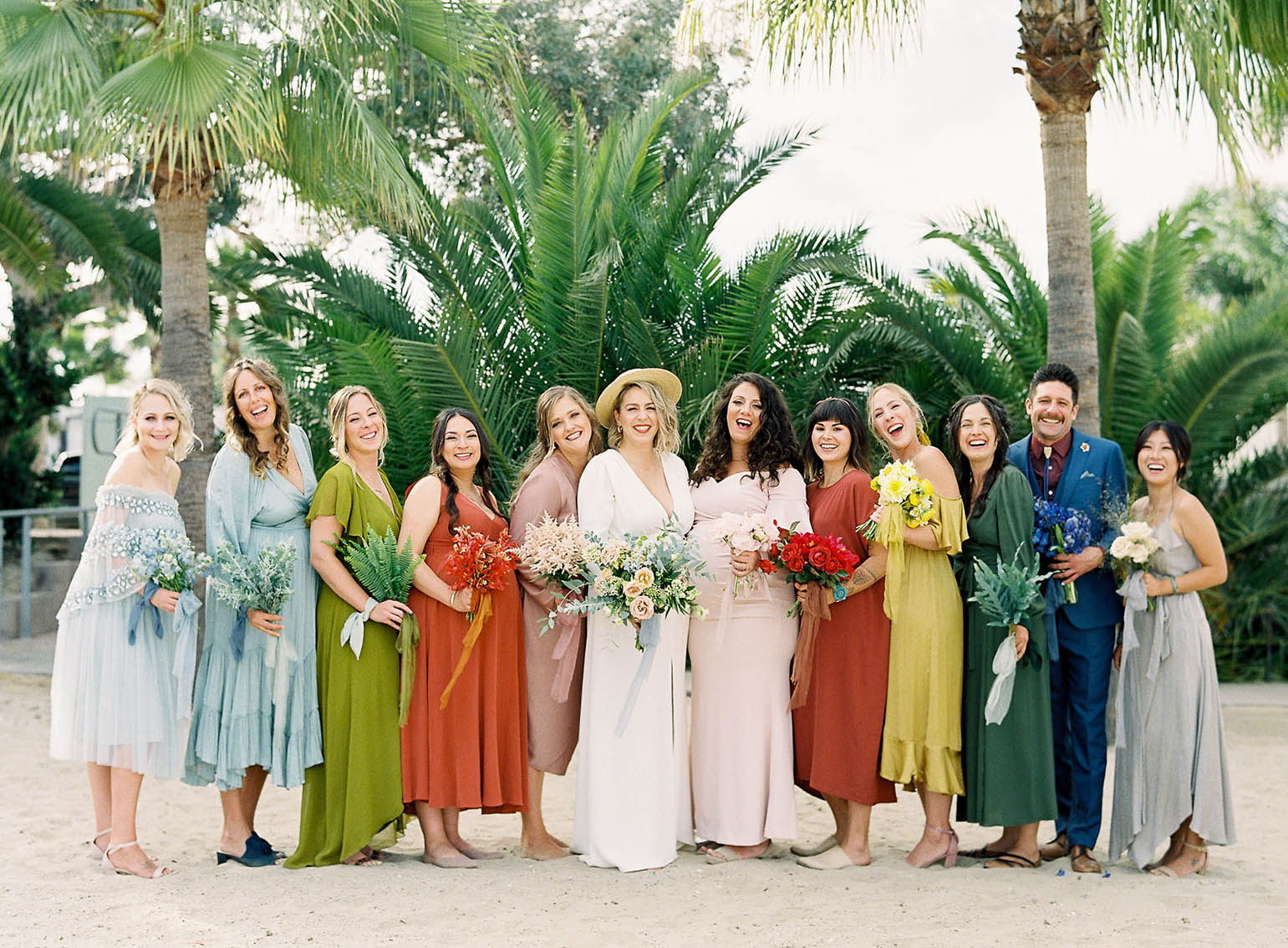 Ngoài ra, đầm phụ dâu không nhất thiết chỉ cùng một tone màu. Hãy cùng xem cách cô dâu đã lựa chọn những gam màu color block rực rỡ nhất cho từng phụ dâu để mang đến một bầu không khí vô cùng tươi vui, mới mẻ cho đám cưới bãi biển có thêm thật nhiều sắc màu hạnh phúc.
