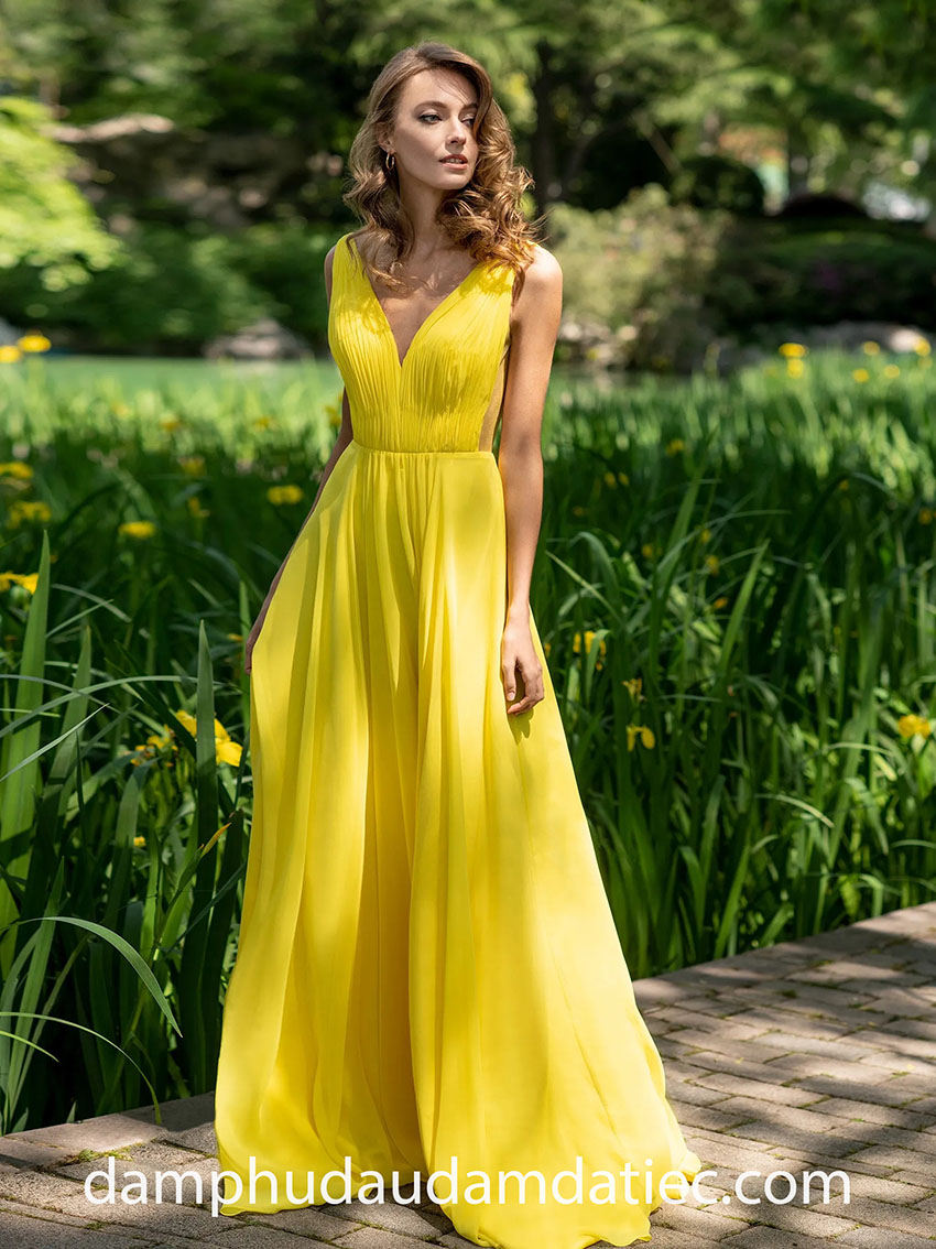 Toả sáng từ những tia nắng ban mai, mẫu váy phụ dâu màu vàng của Pronovias cũng sẽ là một ý tưởng hay ho cho buổi tiệc cưới trên biển của bạn thêm rực rỡ sắc màu.