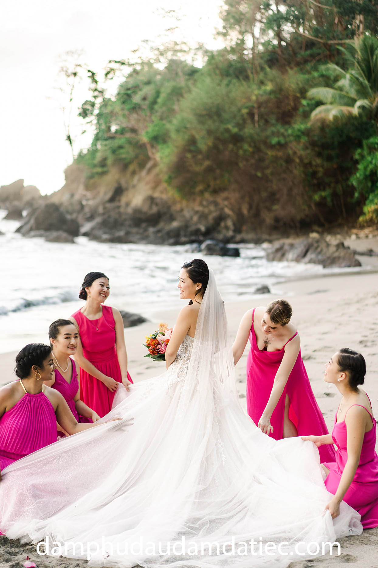 Những mẫu váy phụ dâu màu hồng hot pink với nhiều sắc độ sẽ khiến đám cưới của bạn thêm phần tươi trẻ và giúp cô dâu càng nổi bật hơn giữa không gian biển đảo mênh mông.