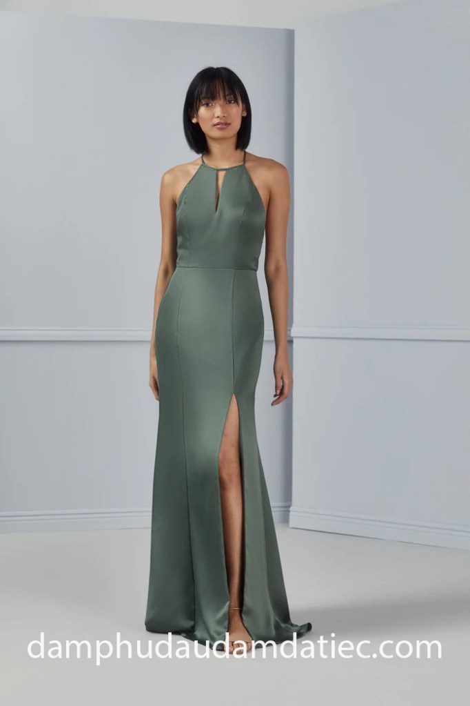 Nhà mốt Amsale tiếp tục giới thiệu đến mùa cưới 2022 mẫu váy phụ dâu xẻ tà cho đám cưới bãi biển thêm gợi cảm với form đầm cổ yếm tôn dáng màu xanh sage lạ mắt.
