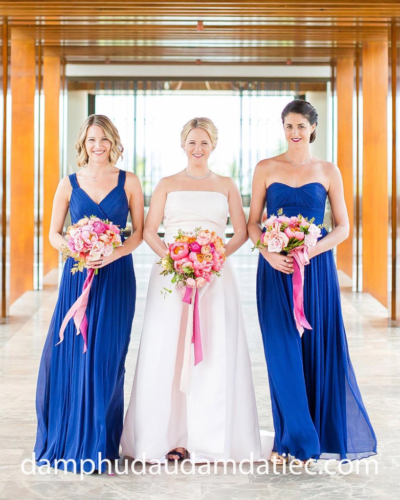 Xu hướng đầm phù dâu 2022 đánh dấu sự trở lại của những mẫu váy phụ dâu màu xanh cobalt cực kỳ hút mắt, giúp cô dâu càng thêm nổi bật hơn trong đám cưới.