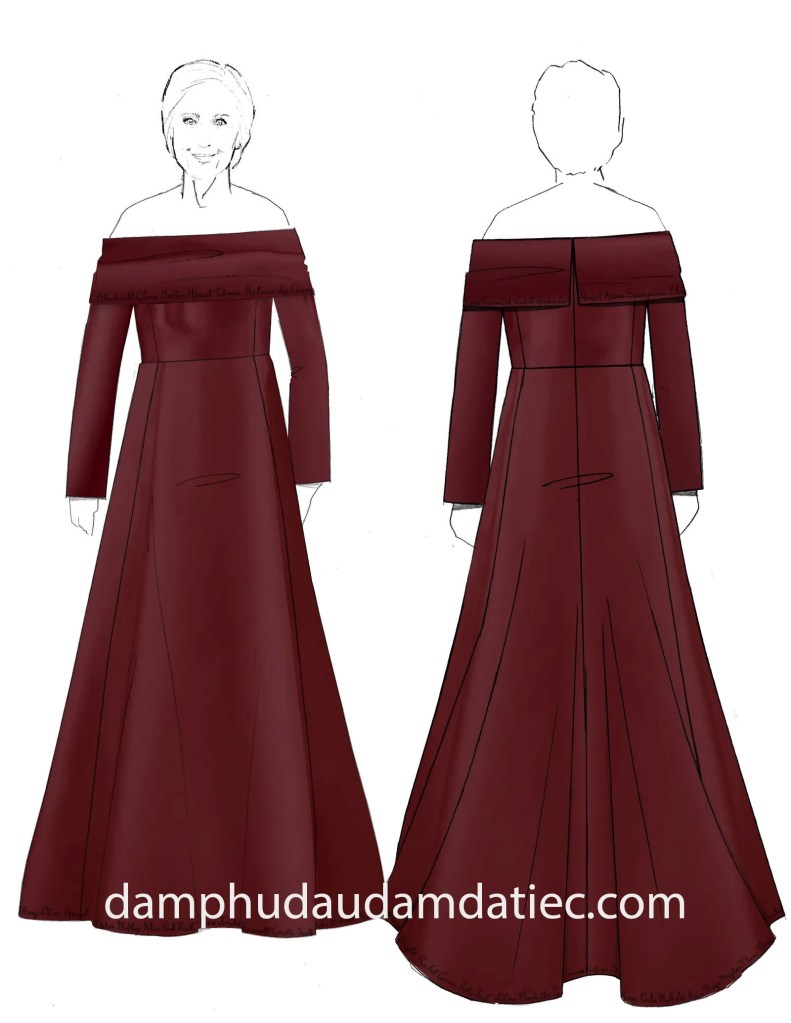 Cựu Đệ Nhất Phu nhân Hoa Kỳ Hillary Clintontrở thành tâm điểm tại thảm đỏ Met Gala 2022, trong một thiết kế đầm dạ hội Joseph Altuzarra với form váy chữ A tùng xoè lộng lẫy, thực hiện trên chất vải satin thượng hạng màu đỏ bordeaux sang trọng. Điểm nhấn đặc sắc ở phần cổ áo trễ vai quý phái diềm chữ thêu ấn tượng.