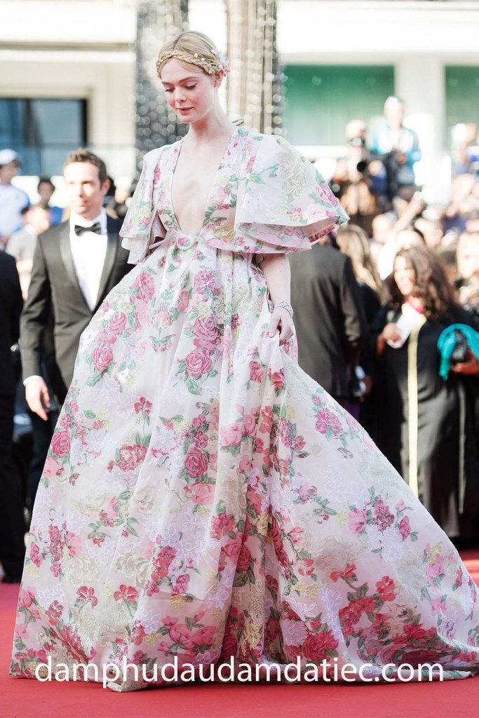 Mỹ nhân Elle Fanning tiếp tục khiến công chúng nức nở khi xuất hiện quá đỗi xinh đẹp trong bộ đầm dạ hội công chúa cổ tích được đích thân nhà mốt Valentino thực hiện riêng cho mình. Thiết kế vừa gợi cảm với chi tiết cổ áo xẻ sâu táo bạo, lại đầy lãng mạn với tay áo cánh tiên cùng tùng váy xoè phồng thêu dệt hoạ tiết hoa cỏ sinh động, rất phù hợp với nét đẹp thần tiên của nữ diễn viên.