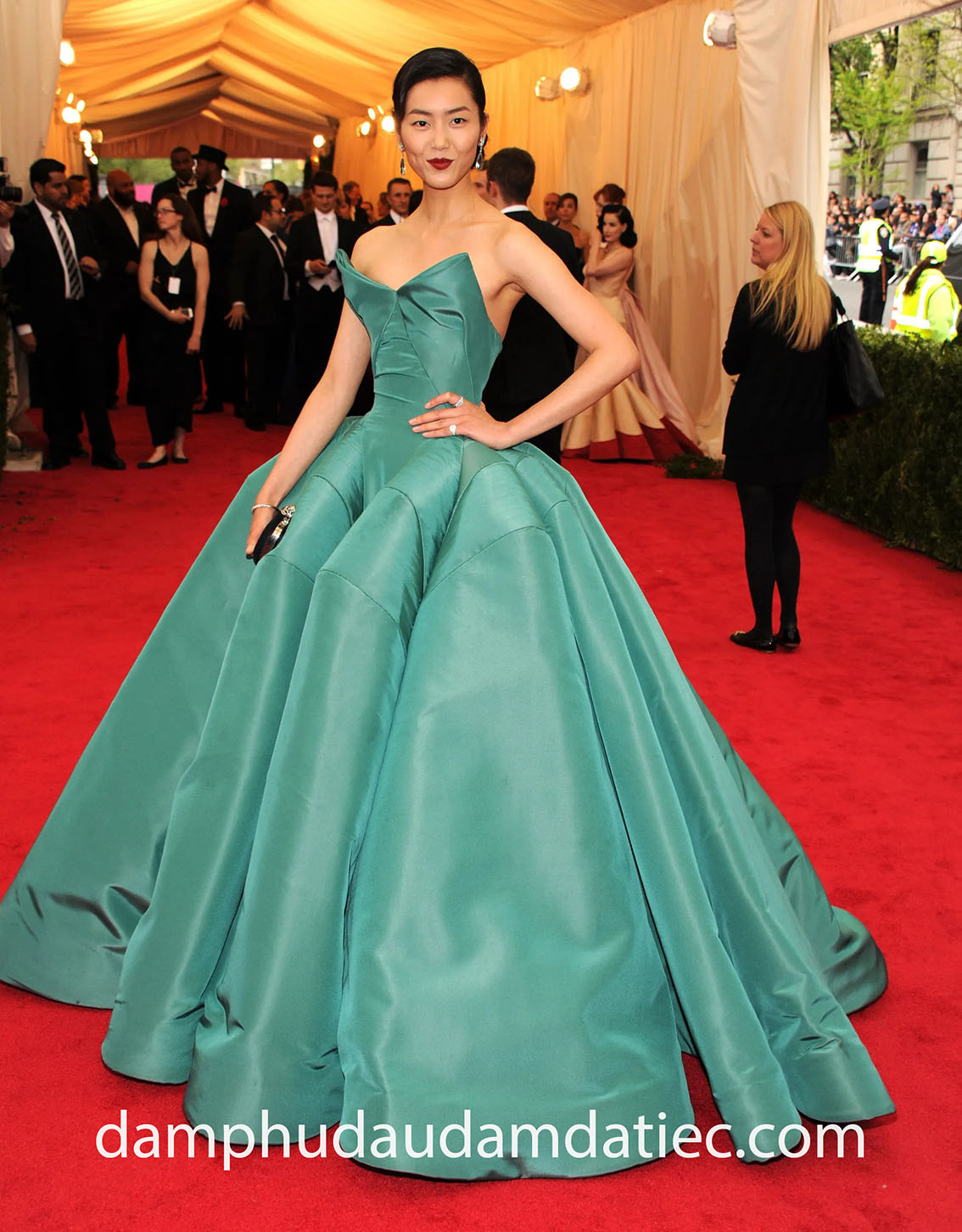 “Siêu mẫu số 1 châu Á” Liu Wen khoe vẻ đài cát trong mẫu đầm dạ hội công chúa dự thảm đỏ được may đo thiết kế riêng từ NTK tài hoa Zac Posen. Mẫu váy thực hiện trên chất liệu satin màu xanh ngọc được xử lý vô cùng tinh vi để tạo nên vẻ ngoài cầu kỳ, khác biệt với các thiết kế thông thường.