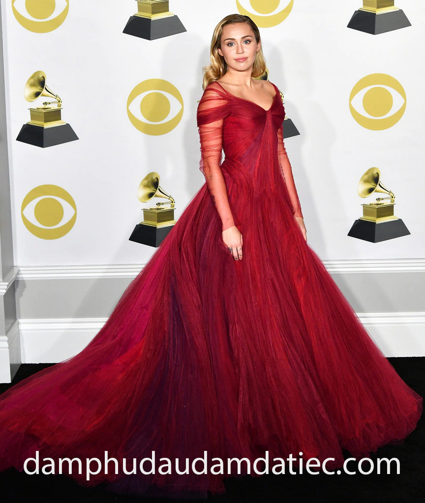 Giọng ca đình đám Miley Cyrus hoá thân thành nàng công chúa cá tính trong mẫu váy dạ hội công chúa lộng lẫy đến từ thương hiệu Zac Posen. Thiết kế gây chú ý trong việc xử lý chất liệu vải lưới xếp li tinh tế, kết hợp kỹ thuật tạo hình độc đáo để mang đến vẻ ngoài vừa sang trọng, gợi cảm mà lại rất hợp với phong cách thời trang của Miley.