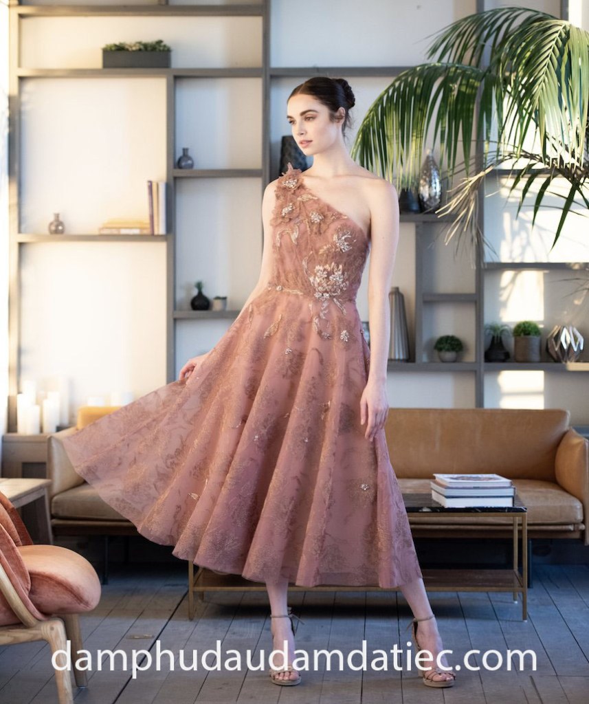 Để sự xuất hiện của bạn thêm phần ấn tượng ở mọi sự kiện, hãy lựa chọn kiểu đầm tea length lệch vai đầy phá cách, kết hợp cùng những chi tiết trang trí tinh tế khắp thân áo mang đến vẻ ngoài thanh lịch, sang trọng dành cho bạn.