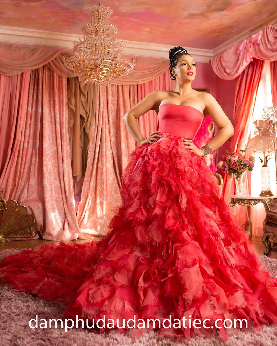 Đầm dạ hội xếp bèo tầng màu đỏ khiến chúng ta liên tưởng đến hình ảnh những cánh hoa hồng bung nở tuyệt đẹp, giúp bạn tự tin toả sáng tại bất kỳ sự kiện nào mà mình tham dự.