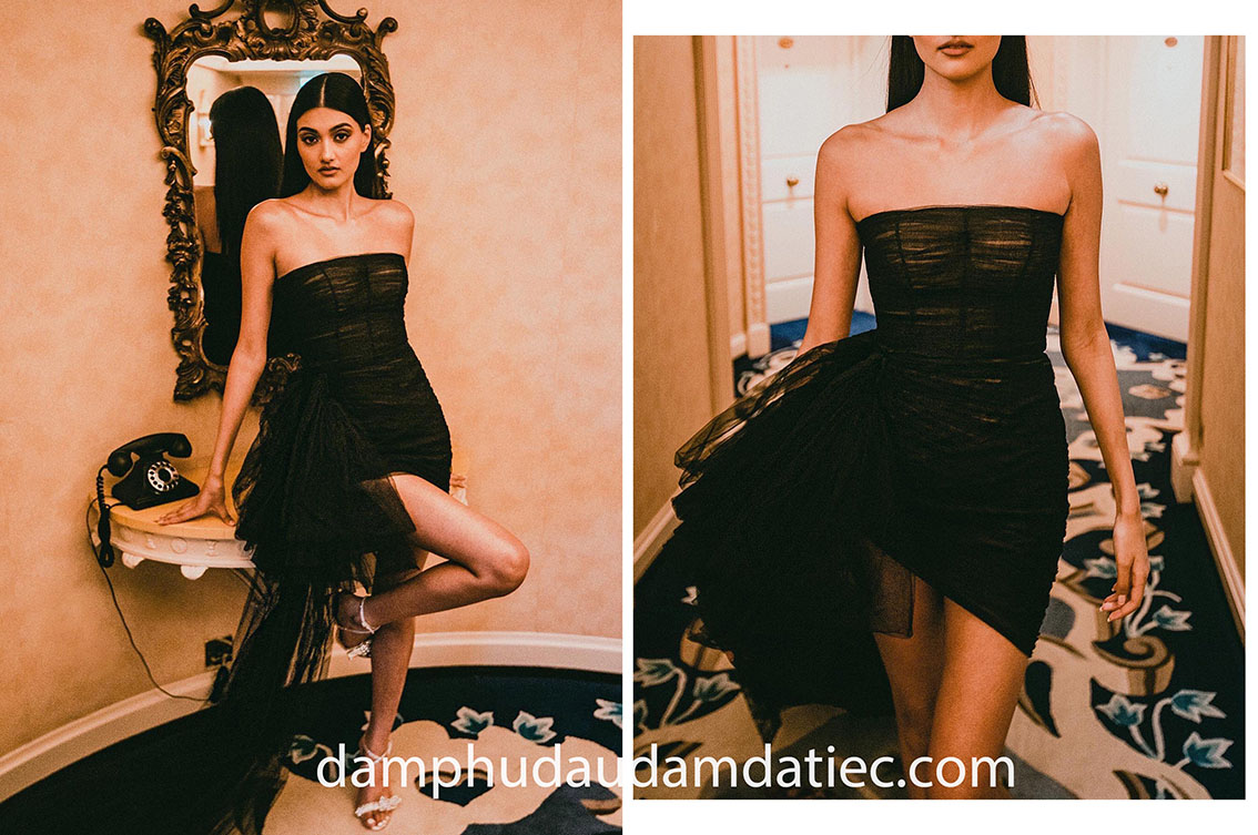 Trong những sự kiện thảm đỏ đòi hỏi sự nổi bật và thể hiện rõ nét dấu ấn cá nhân, đầm dạ hội cúp ngực corset xuyên thấu với gam màu đen huyền bí, thực hiện trên chất vải lưới chấm bi đính kết ren tinh xảo, phối cùng găng tay có thể tháo rời sẽ khiến tất cả mọi quan khách đều phải trầm trồ trước gu thời trang sành điệu của bạn.