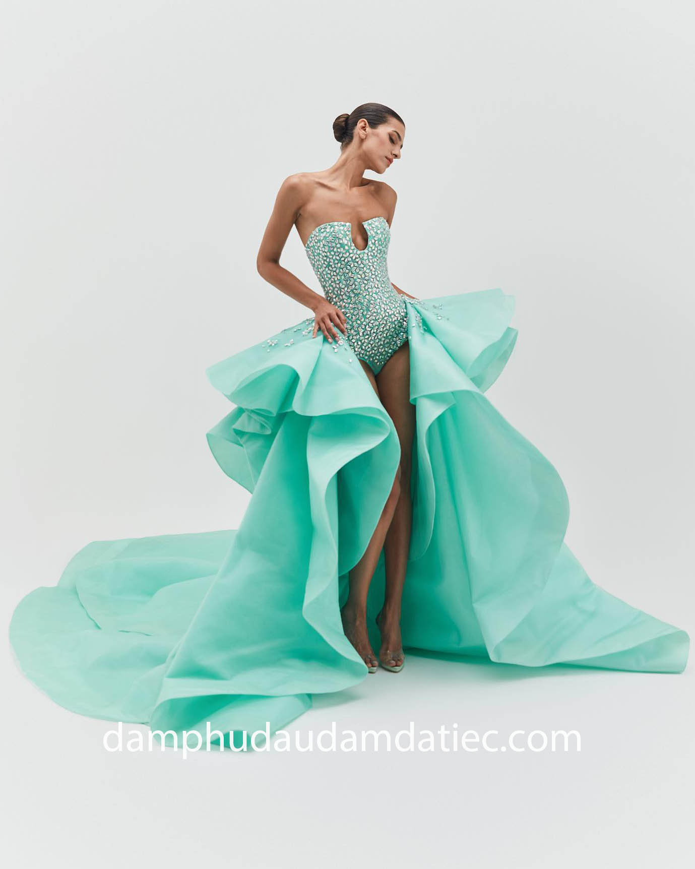 Định nghĩa đầm dạ hội 2 trong 1 là kiểu đầm được thiết kế đặc biệt có thể thay đổi linh hoạt, gồm phần thân áo chính với đa dạng kiểu mẫu từ đầm ngắn, kiểu chữ A, váy đuôi cá,… phối hợp cùng tùng váy xoè hoành tráng bên ngoài để làm gia tăng vẻ ngoài lộng lẫy, thu hút mọi ánh nhìn về phía chủ nhân của bộ trang phục.