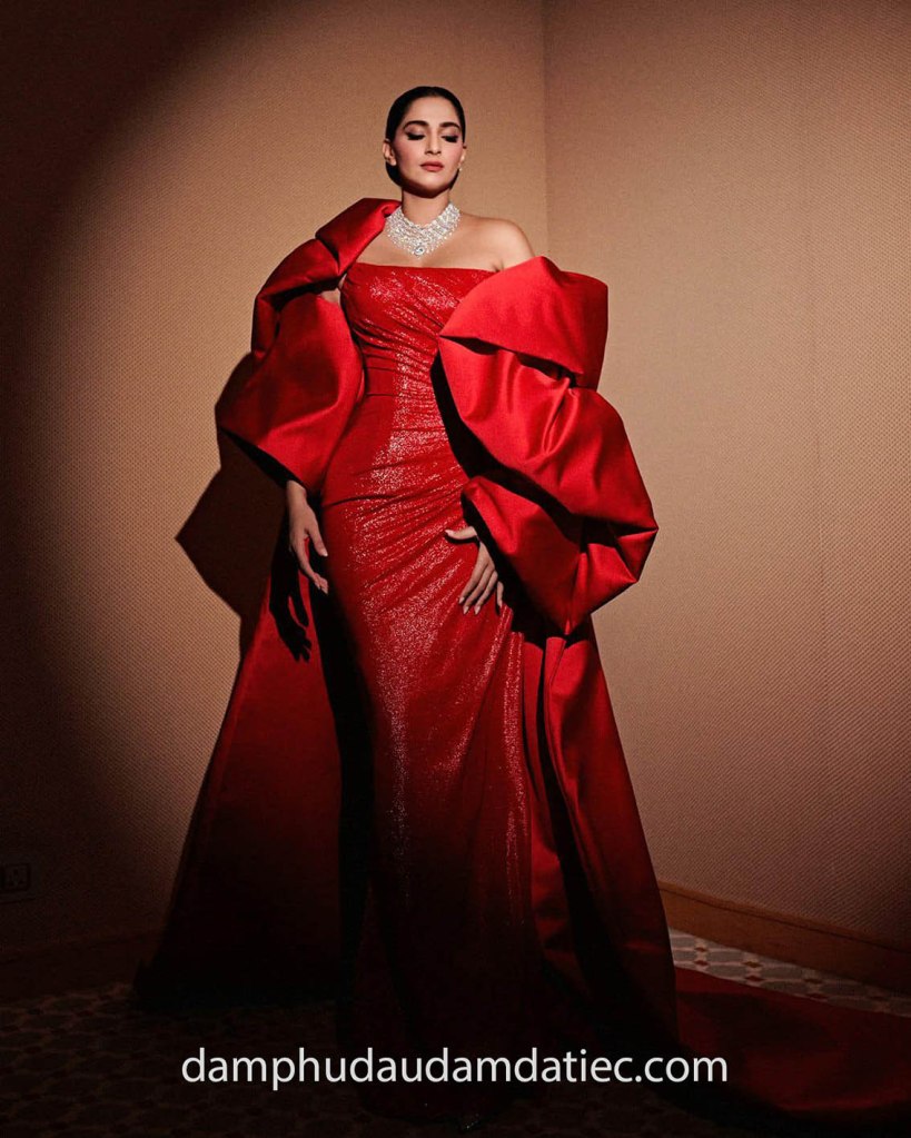 Hay bạn cũng có thể phô diễn sắc vóc quyến rũ với kiểu đầm dạ hội 2 trong 1 có thân áo đuôi cá lấp lánh, tôn vinh vóc dáng đồng hồ cát. Đặc biệt phần áo choàng tay phồng với màu đỏ rực rỡ sẽ là phụ kiện lý tưởng để hoàn thiện vẻ ngoài sành điệu cho bạn.