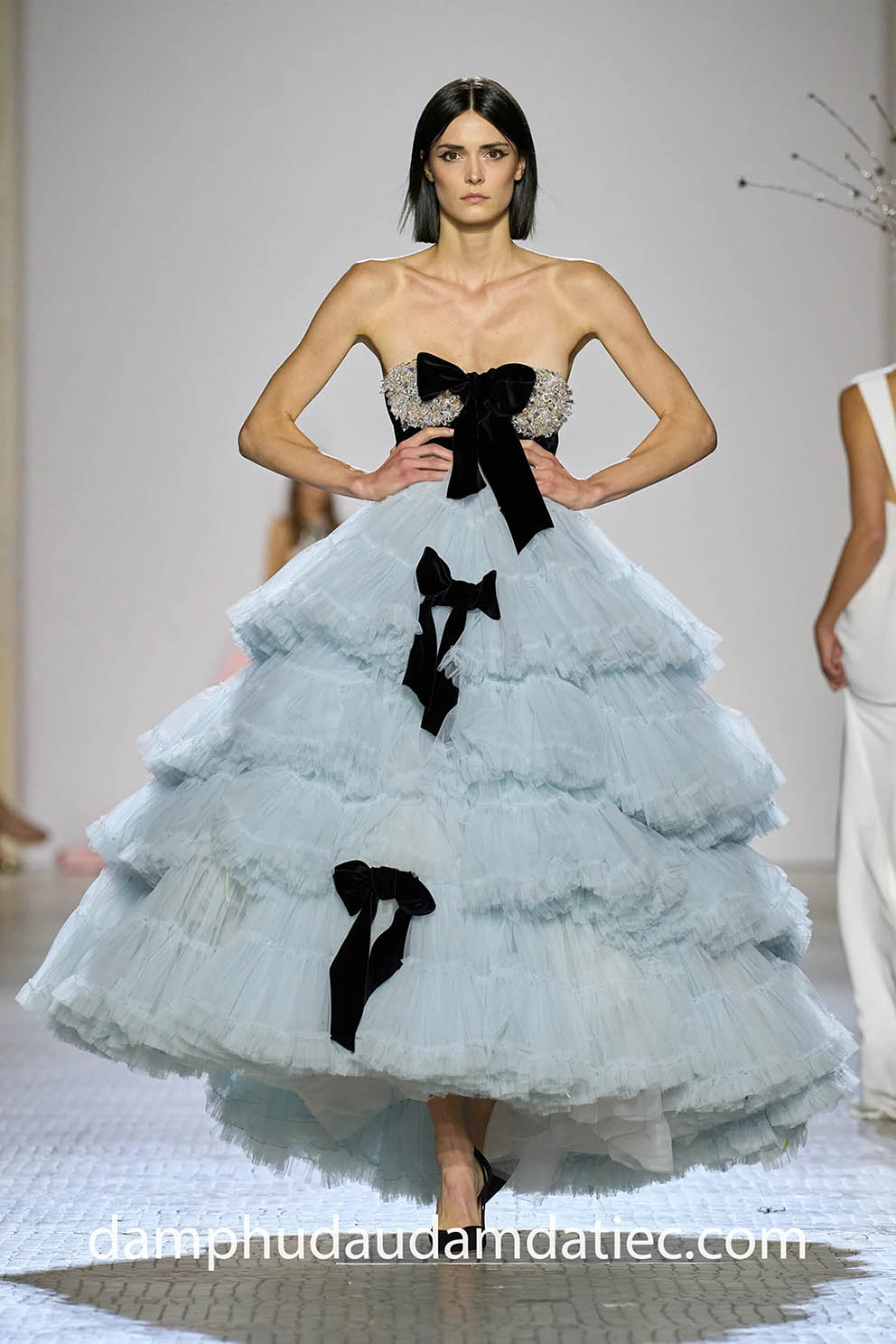 Giambattista Valli chiêu đãi mùa Haute Couture Thu Đông 2023 những thiết kế mang đậm DNA của hãng. Vẫn là lối thiết kế phóng đại với những nếp xếp tinh tế, những chi tiết dập li cùng chi tiết xếp bèo tầng ấn tượng, được chế tác công phu trên các chất liệu cao cấp mang tone màu pastel đầy thơ mộng. Năm nay, nhà mốt gửi đến các quý cô sành điệu những mẫu đầm dự tiệc ngắn Haute Couture tuyệt đẹp giúp khoe khéo đôi chân nuột nà, đi cùng các điểm nhấn thật đắt giá.