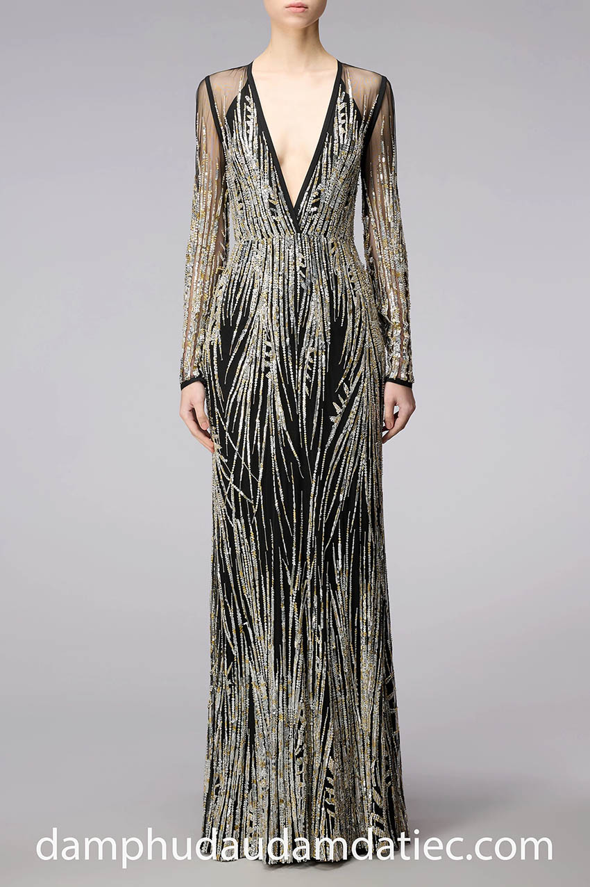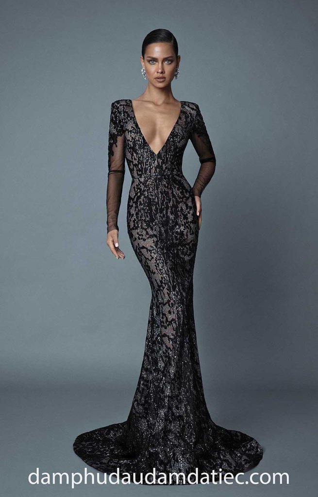 VÁY DẠ HỘI CỔ V TAY DÀI