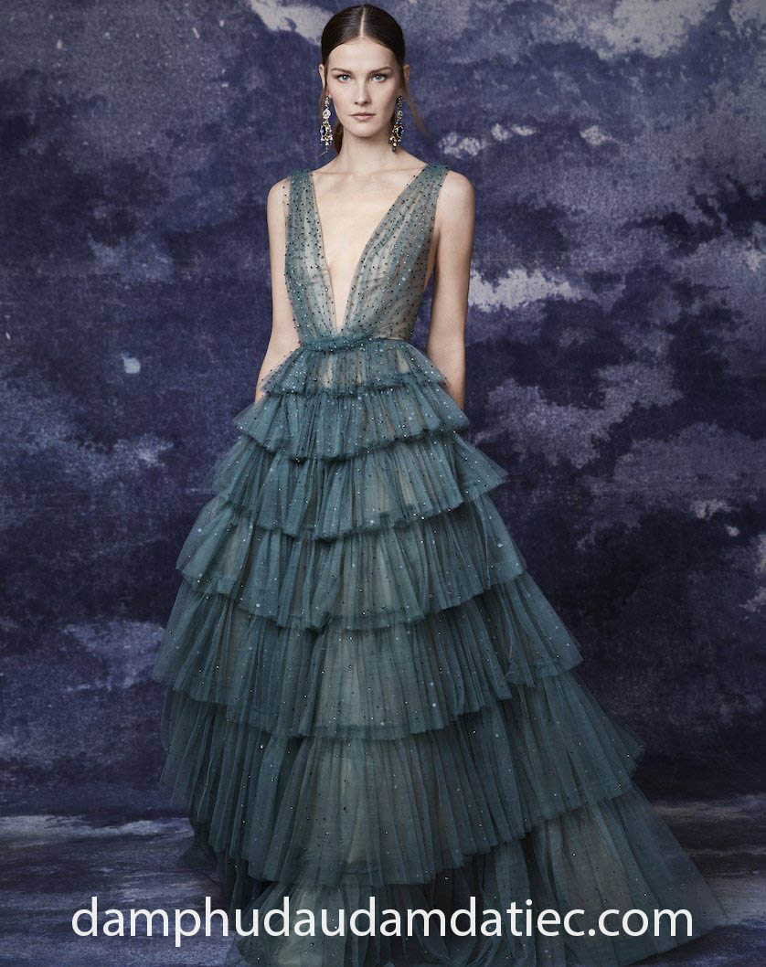 Dành tặng các quý cô ưa chuộng phong cách thời trang điệu đà, lãng mạn: váy dạ hội cổ V tùng xếp bèo tầng mang đến cho bạn phong cách hấp dẫn khó thể chối từ của một fashionista chính hiệu.
