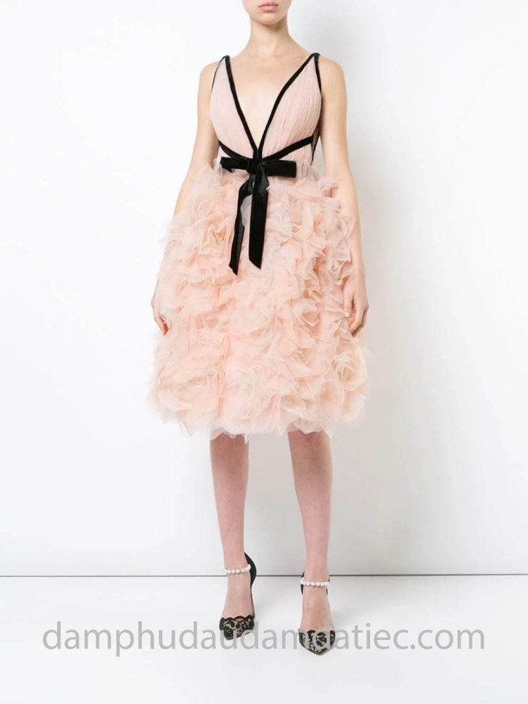 ĐẦM DẠ HỘI MÀU DA XẾP BÈO TRANG TRÍ