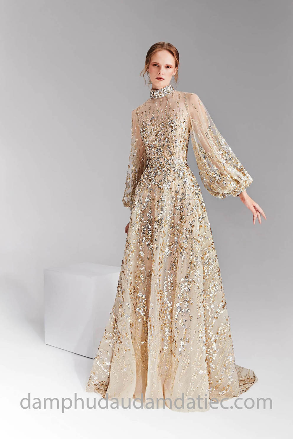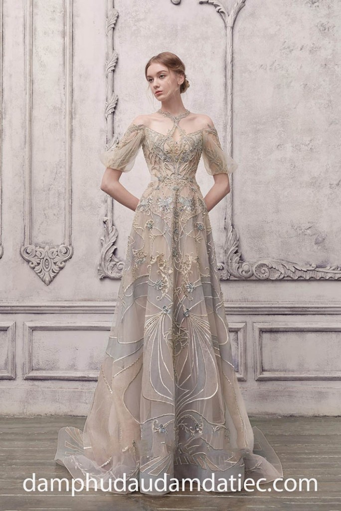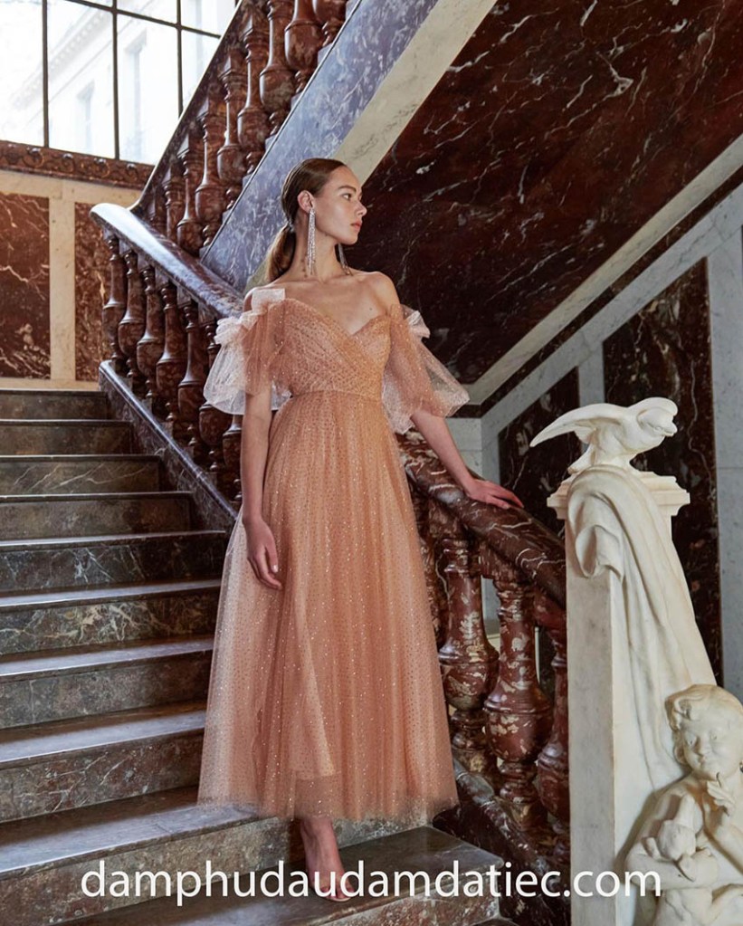 ĐẦM DẠ HỘI MÀU DA TAY KIỂU