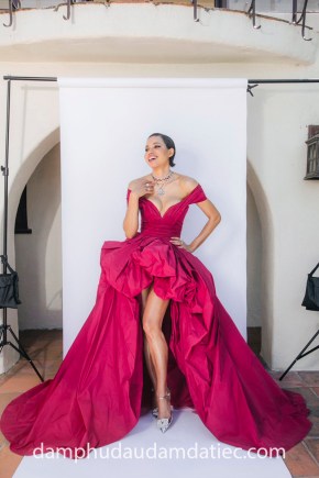 Đầm dạ hội màu đỏ cúp ngực xẻ tà quyến rũ trên nền vải satin thượng hạng